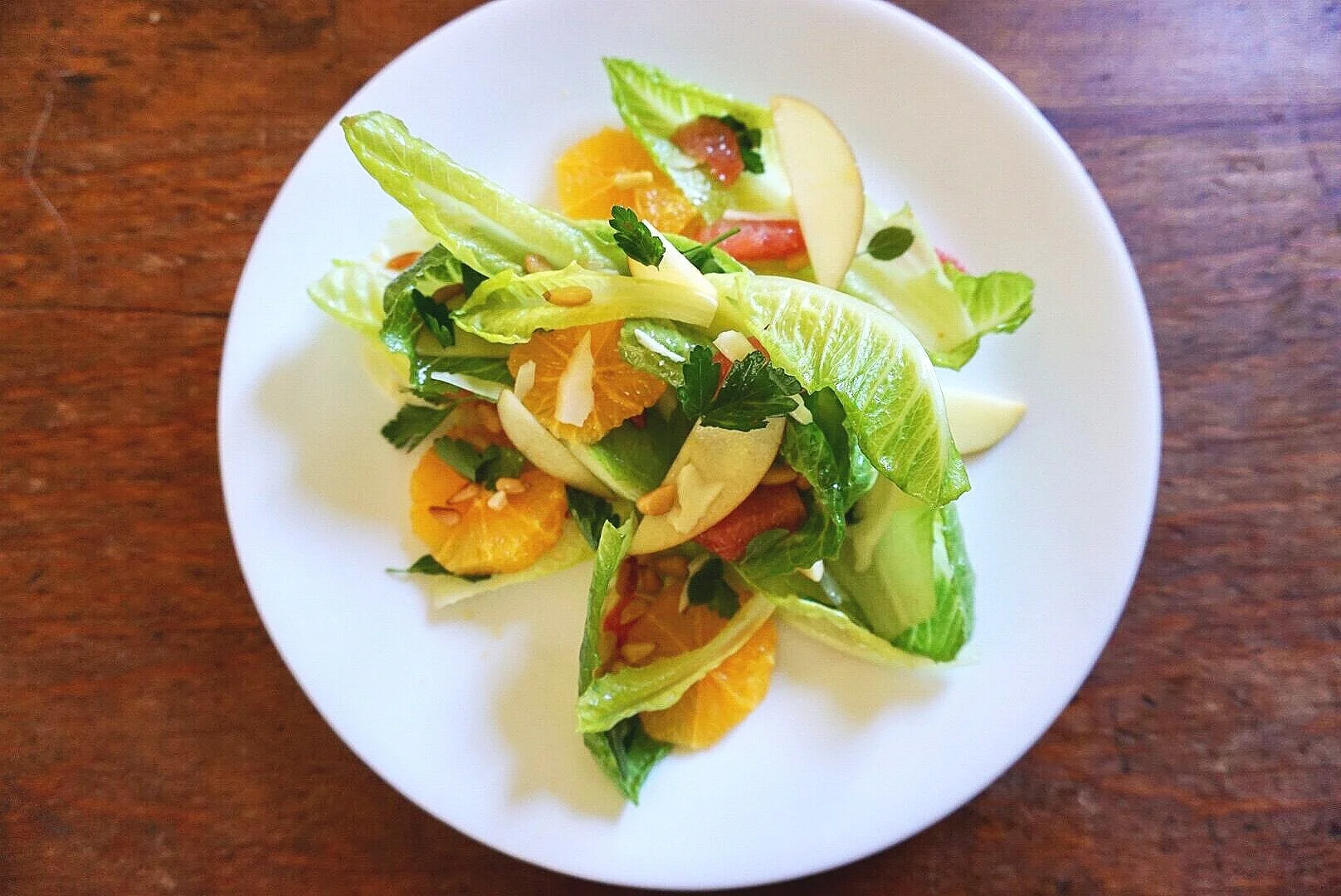 Place Petite Romaine leaves on your serving dish or plate, add both oranges, add apples, and sprinkle pine nuts over the top.